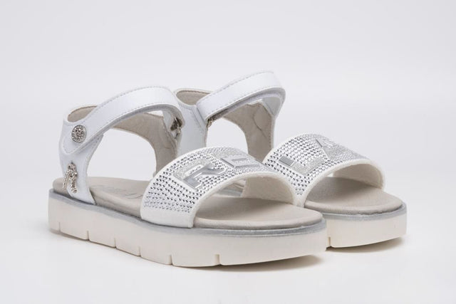 Πέδιλα από τη νέα συλλογή για παιδιά της Replay. Το πάνω μέρος καθώς και η επένδυση είναι κατασκευασμένα από οικολογικό υλικό. Το μπροστινό μέρος διαθέτει το logo της εταιρείας επενδυμένο με strass σε ασημί χρώμα.