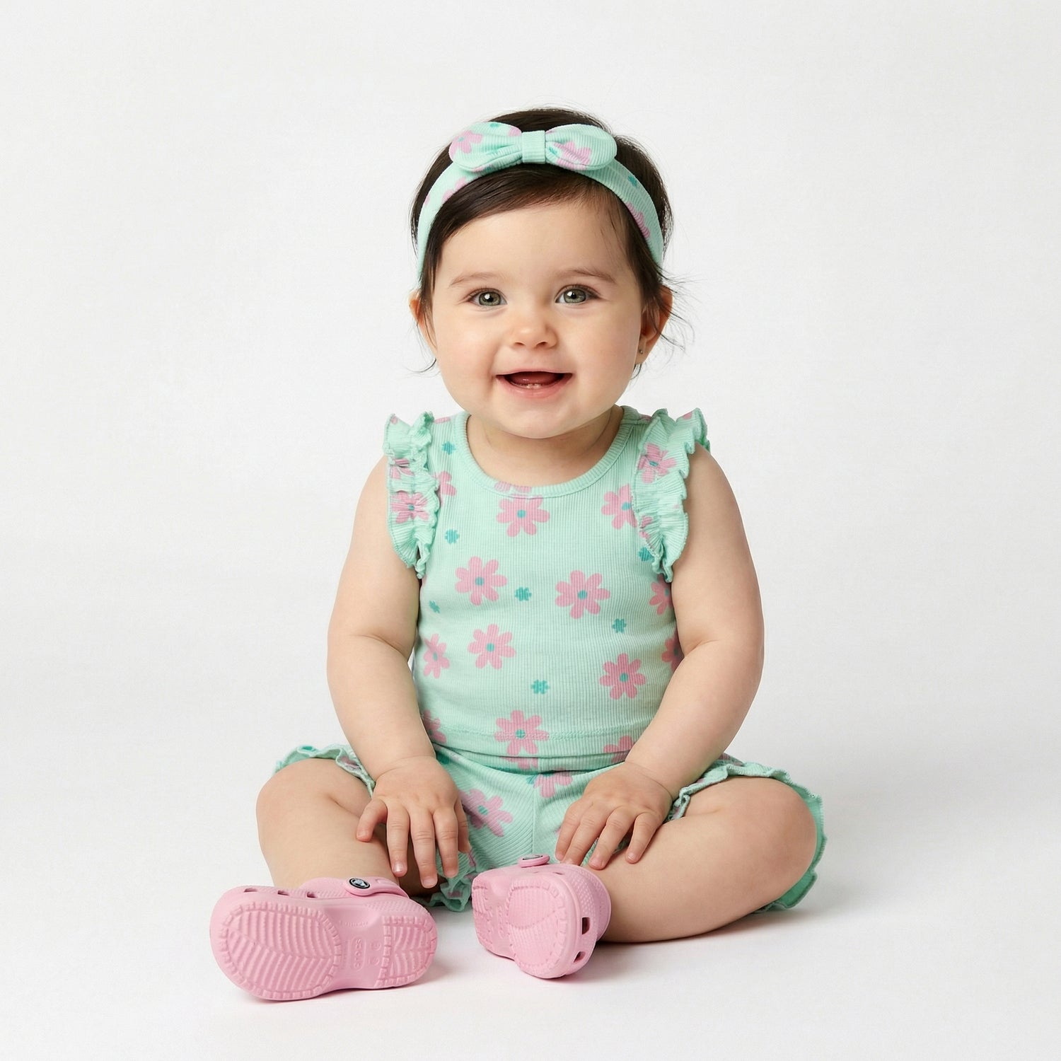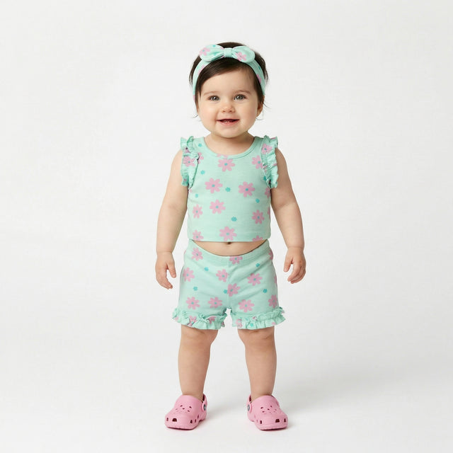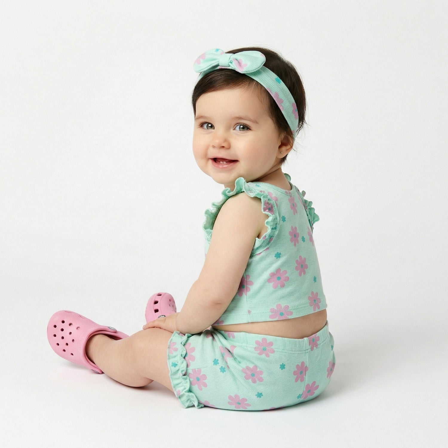 Χαρίστε στη μικρή σας το πιο γλυκό και δροσερό look του καλοκαιριού! Αυτό το ολοκληρωμένο σετ σε απαλή mint απόχρωση είναι σχεδιασμένο για να προσφέρει άνεση στο παιχνίδι και στυλ στις πρώτες της βόλτες.