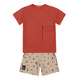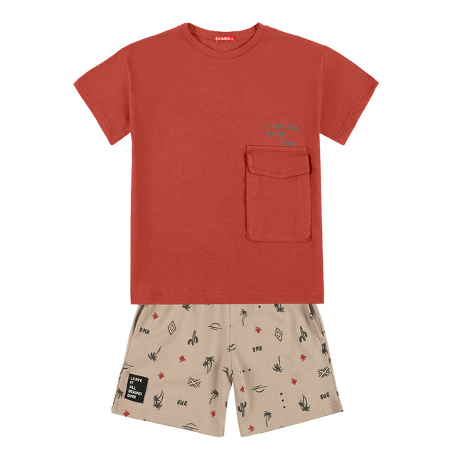 This set includes a short-sleeved top with a minimal design and a practical pocket on the front, combined with shorts featuring tropical-inspired patterns. Its comfortable fabric and casual line make it ideal for everyday looks, offering style and practicality.
