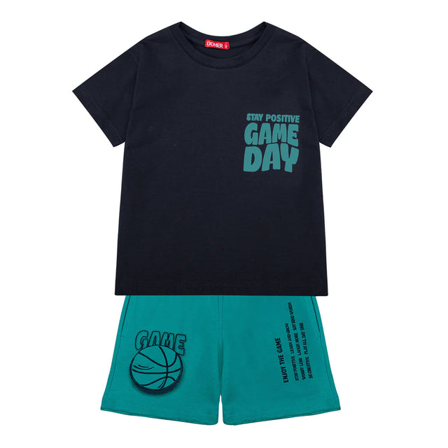 This sporty kids' set consists of a short-sleeved T-shirt and shorts, ideal for active and stylish looks. The T-shirt features a minimal print with the message "Stay Positive - Game Day" , radiating athletic spirit and positive energy. The shorts, with a comfortable fit, stand out with modern prints that include a basketball design and motivational quotes, as well as side details that enhance the sporty look. A perfect set for little athletes who love to play and move!