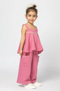 An elegant and airy set consisting of a sleeveless blouse with wide straps and decorative piping on the chest, as well as a pair of comfortable pants with large pockets and discreet details. Its fabric is light and cool, ideal for summer days.