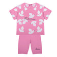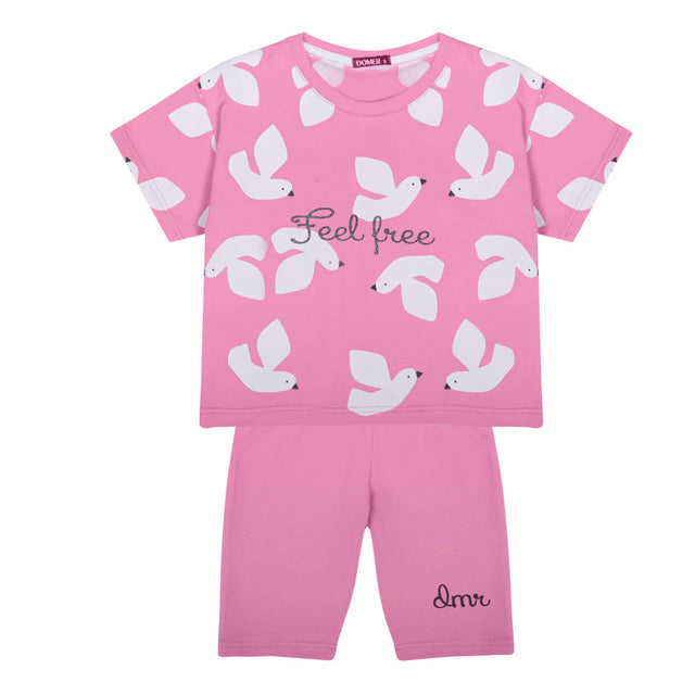 The set consists of a short-sleeved T-shirt with a loose fit, decorated with a dove pattern and the phrase "Feel free" in the center, giving a sense of freedom and carefreeness. It is accompanied by a comfortable Bermuda with a discreet logo on the leg, ensuring comfort and ease of movement. Ideal for summer looks with style and a cheerful mood.