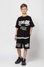 The set consists of a short-sleeved T-shirt and a pair of shorts with a relaxed fit. The T-shirt features a round neckline and a large print on the front, which includes dynamic graphics and a message with a stylistic emphasis. The shorts are in a comfortable fit, with a print on one leg that matches the design of the T-shirt, giving a harmonious and modern aesthetic. The set is made of soft fabric, ideal for everyday comfort and style.