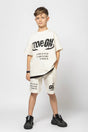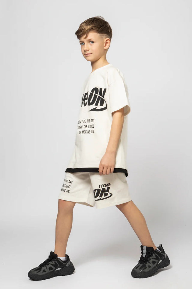 The set consists of a short-sleeved T-shirt and a pair of shorts with a relaxed fit. The T-shirt features a round neckline and a large print on the front, which includes dynamic graphics and a message with a stylistic emphasis. The shorts are in a comfortable fit, with a print on one leg that matches the design of the T-shirt, giving a harmonious and modern aesthetic. The set is made of soft fabric, ideal for everyday comfort and style.