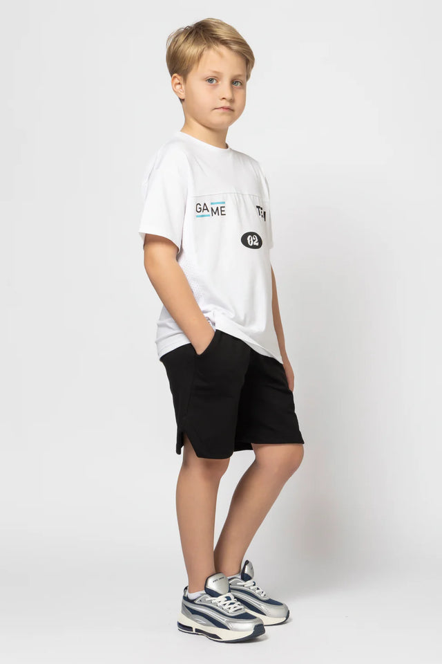The set consists of a short-sleeved T-shirt and a pair of shorts with a sporty character. The T-shirt has a round neckline and a modern print on the front, with inscriptions and numbers that refer to a sporty style. On the back, there is a larger print with graphics and text that enhances the dynamic style of the design. The shorts are in a comfortable line, with a length above the knee and discreet details on the sides. The fabric is light and breathable, ideal for everyday use and comfortable movement.