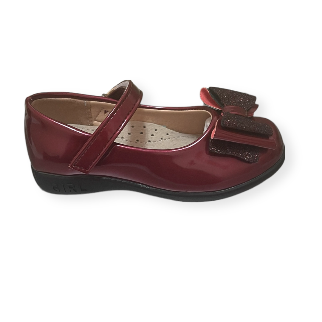 Patent leather ballerinas from the company TOYITI. Non-slip with leather sole and inner leather lining. Closes with velcro and has an anti-slip sole. Decorative rhinestone bow.