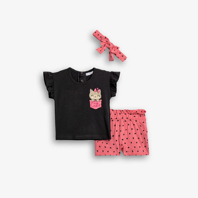 Σετ μπλούζα κάλτσα λύκρα με τύπωμα (γατάκι) και σόρτς με τύπωμα allover και κορδέλα σε χρώμα ανθρακί/crayon rouge για κορίτσι μηνών 95% COTTON-5% ELASTAN