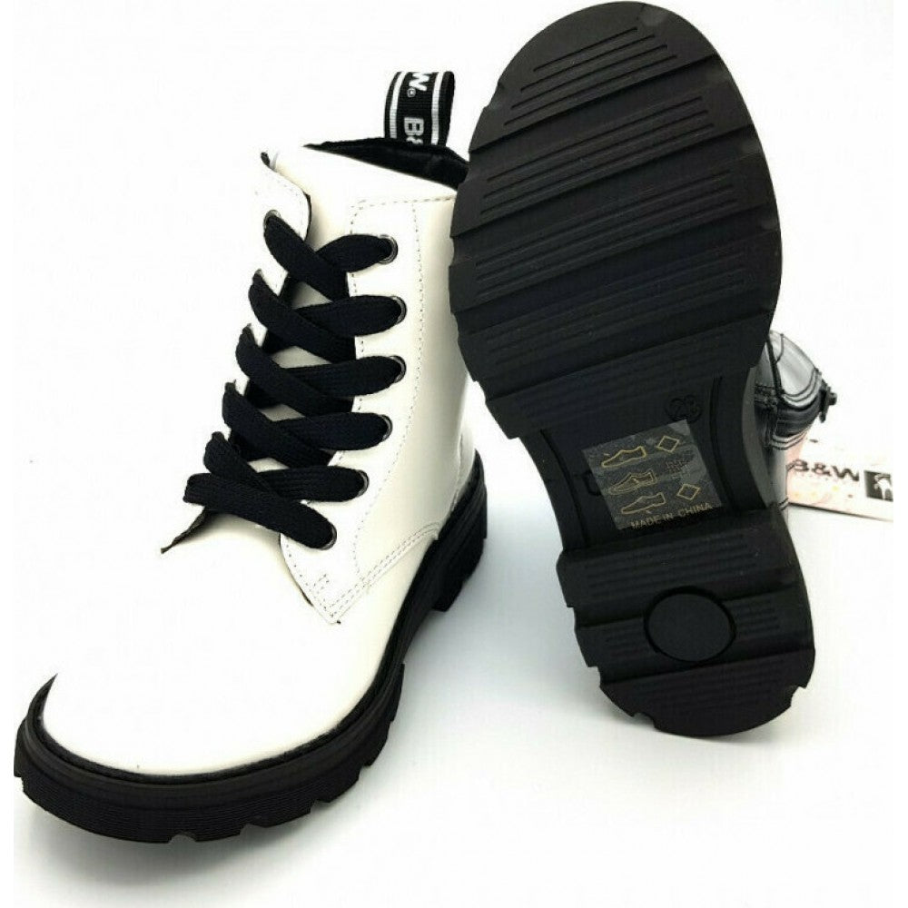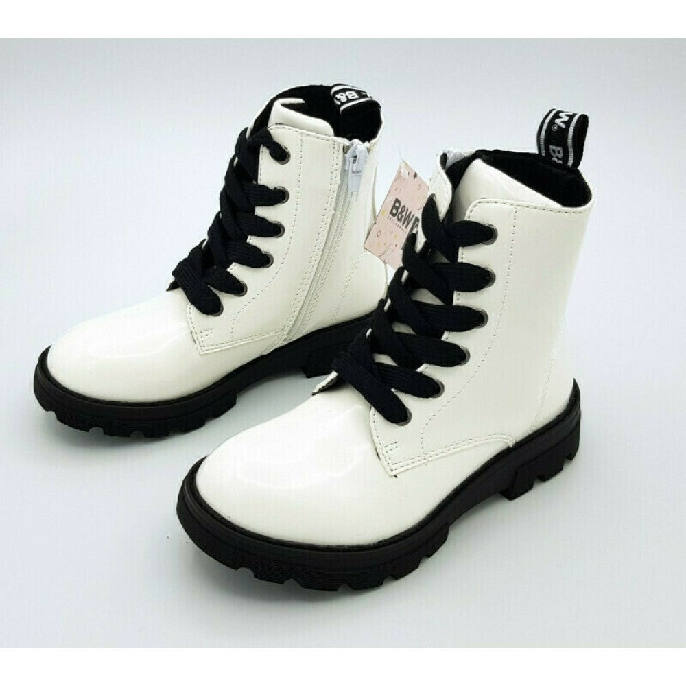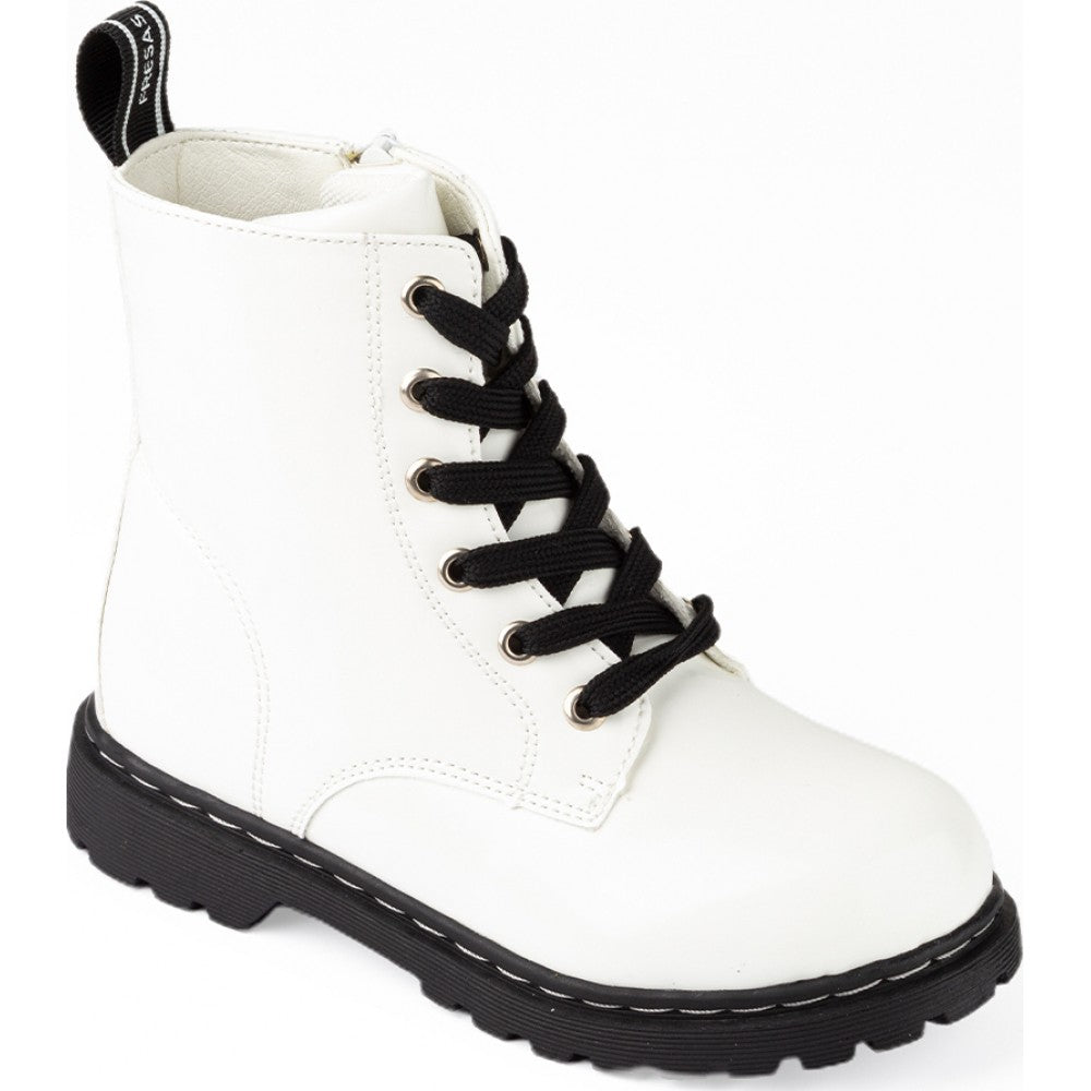 Conguitos ankle boots in white with black details on the laces and sole. They have laces and side zips for easy fit. The notched sole provides increased comfort and traction, also stitched to the floor for added durability.