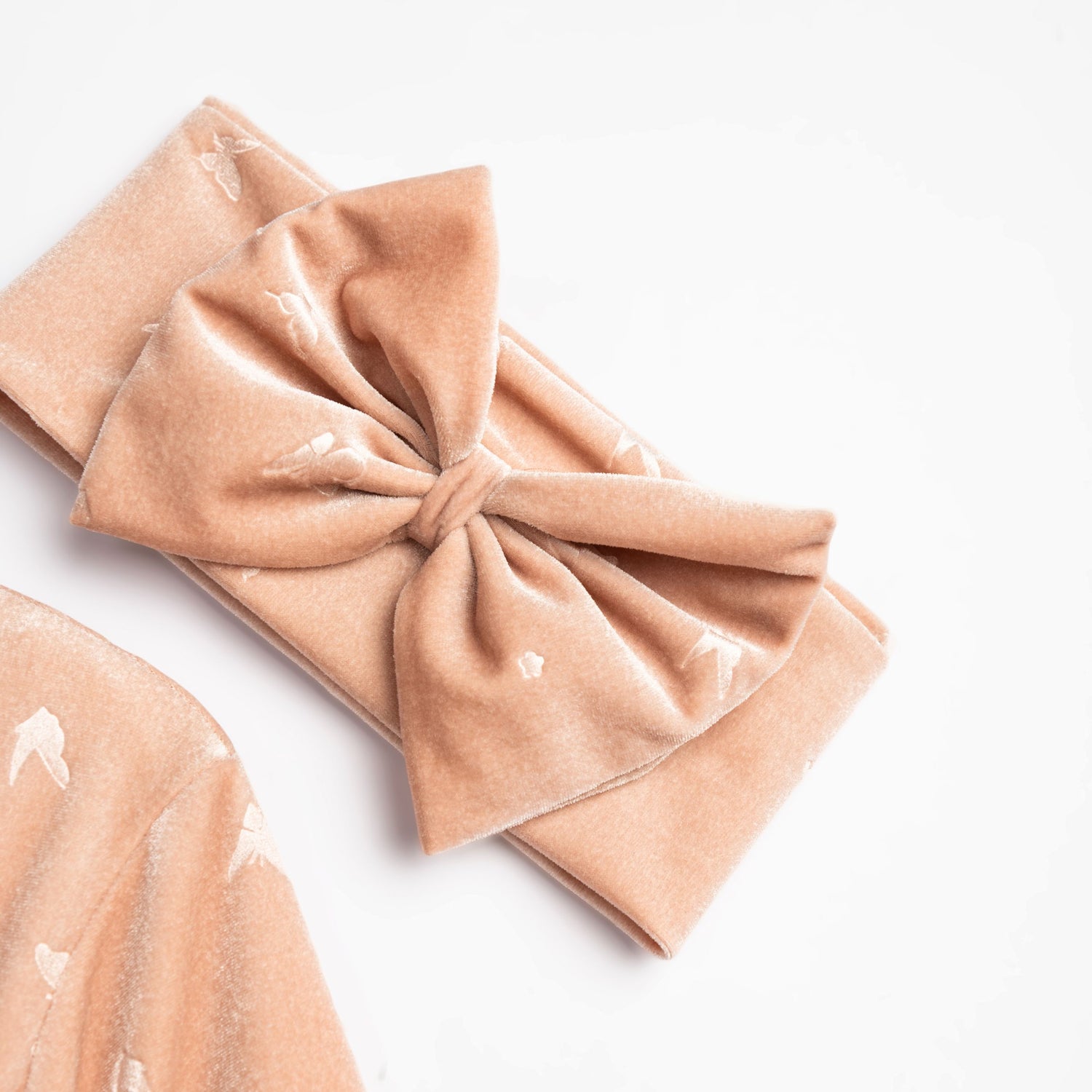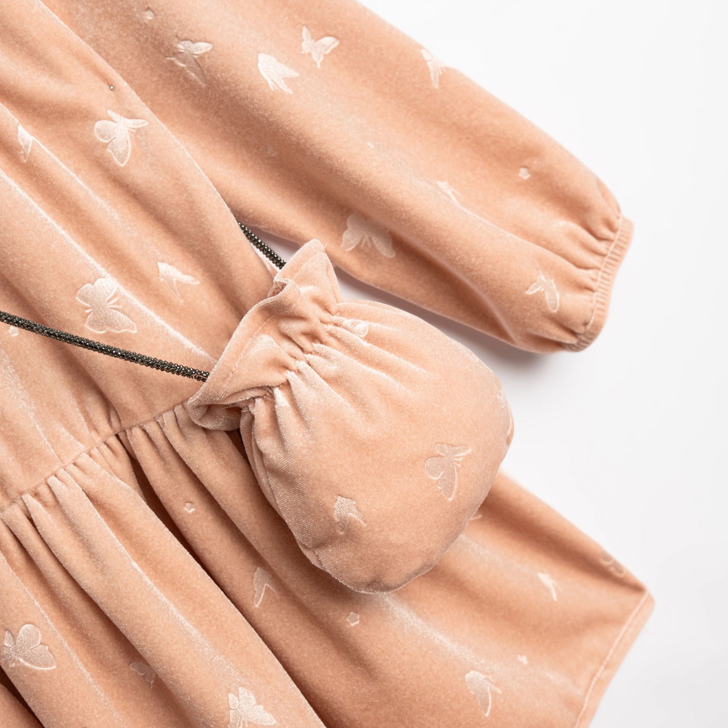 Φόρεμα με κορδέλα και τσαντάκι βελουτέ για κο΄ριτσι 2-6 ετών σε χρώμα ροζ με λεπτομέρεις με μικρές πεταλούδες ροζ