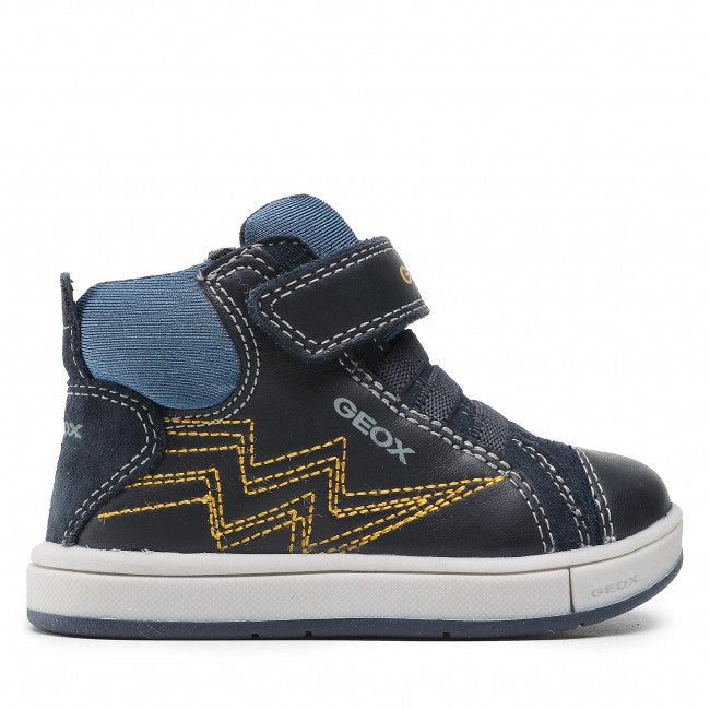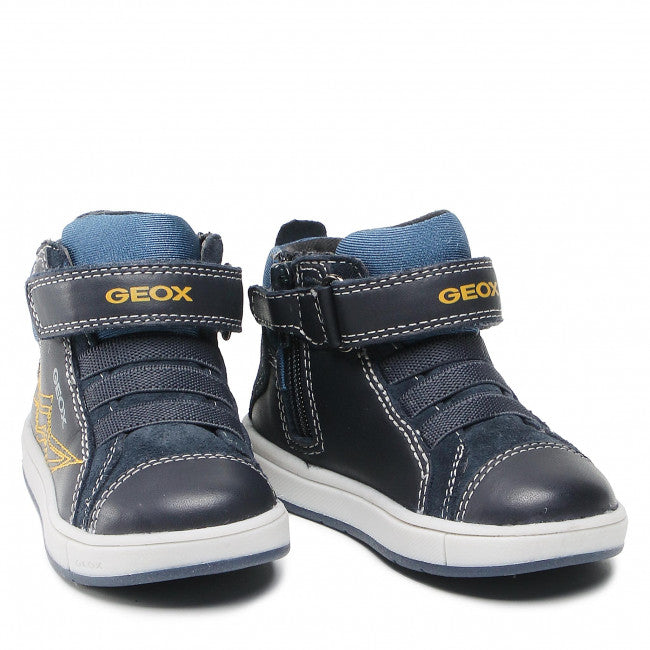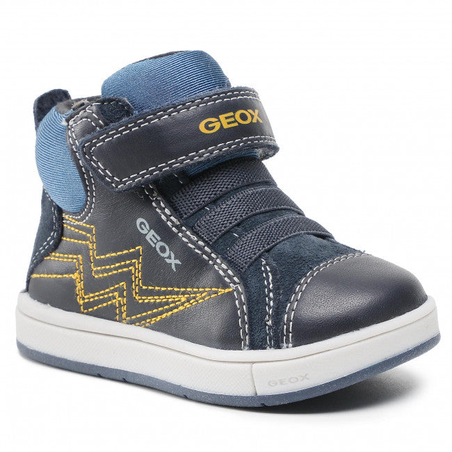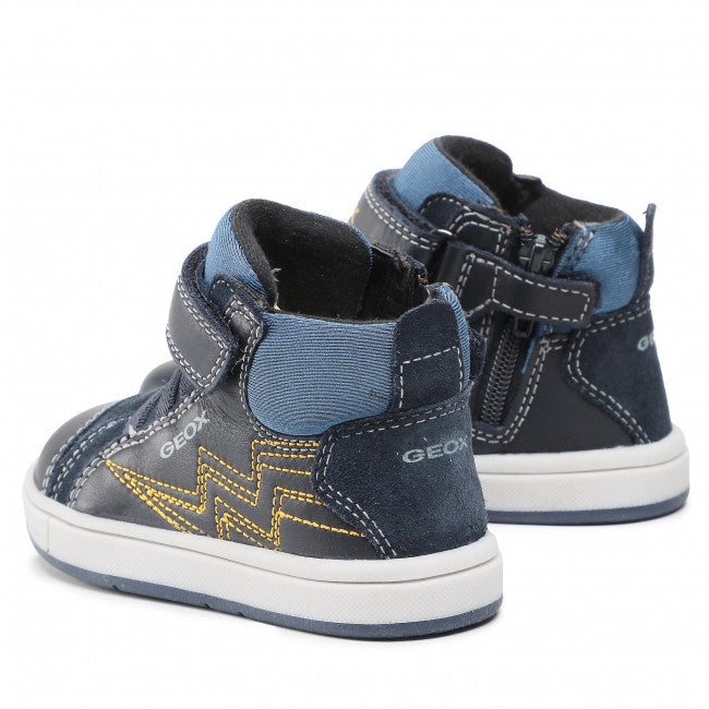 Παιδικό μποτάκι Geox με δερμάτινο, αποσπώμενο και ανατομικό πατάκι που επιτρέπει στο πόδι να ανπνέει με τη μοναδική τεχνολογία Geox Respira και αντιβακτηριακή σόλα. Eco-leather και suede εξωτερικά σε μπλέ χρώμα με κίτρινες λεπτομέρειες. Με Velcro- αυτοκόλλητο και ελαστικά κορδόνια για εύκολη και γρήγορη εφαρμογή.