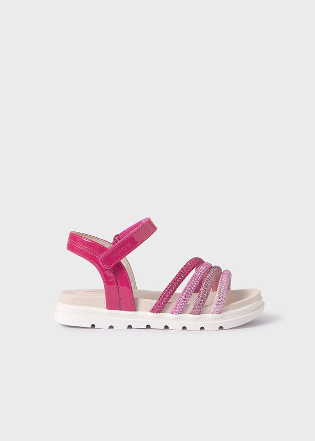 Παιδικά πέδιλα από την εταιρεία Mayoral με στρας που απογειώνουν το στυλ του παιδιού, κατάλληλα και για καθημερινή χρήση. Δένουν εύκολα με αυτοκόλλητο velcro ώστε να μπορεί το παιδί να είναι αυτόνομο και να δένει τα παπούτσια του.Διαθετει ευλυγιστη ανετη σολα και αντιολισθητικη.