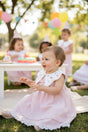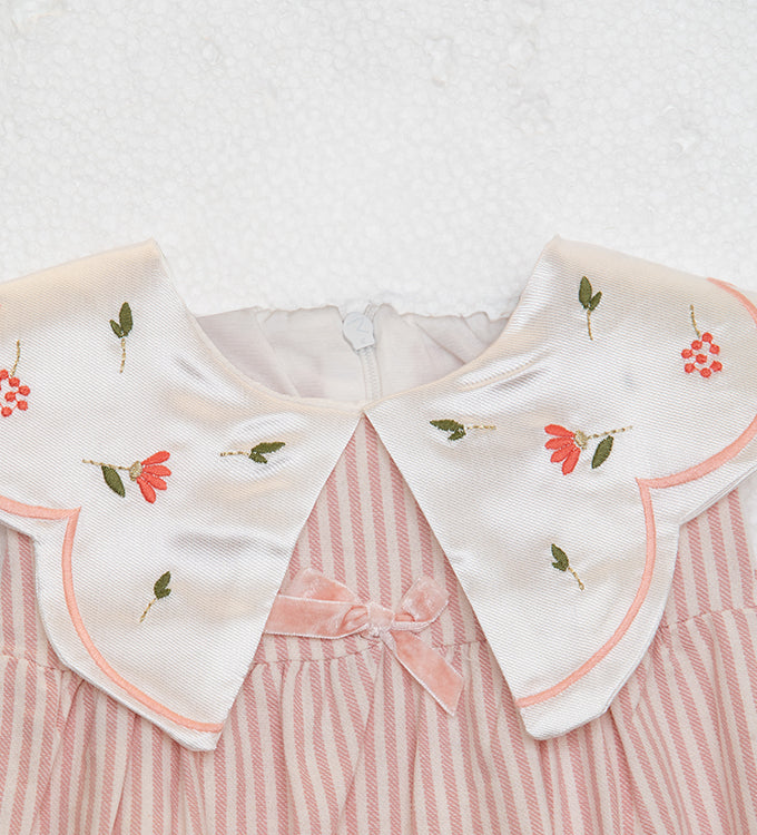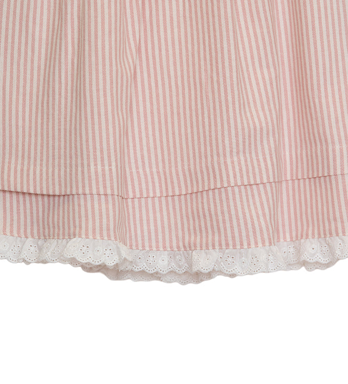 Το παιδικό ρούχο restart της φωτογραφίας είναι ένα αέρινο και ρομαντικό αμάνικο φόρεμα σε απαλό ροζ χρώμα με λευκές ρίγες, ιδανικό για καλοκαιρινές και επίσημες εμφανίσεις.