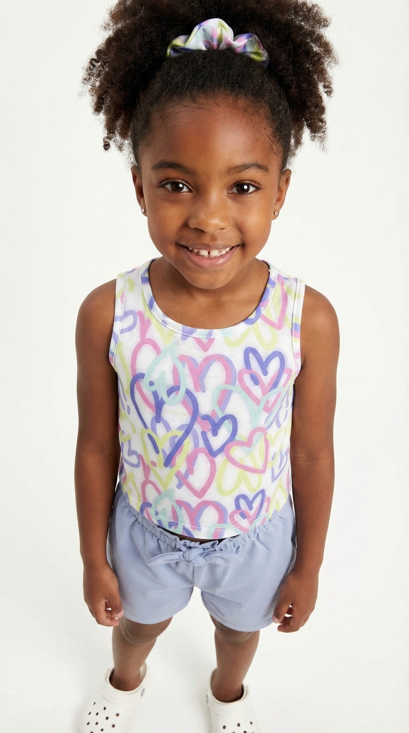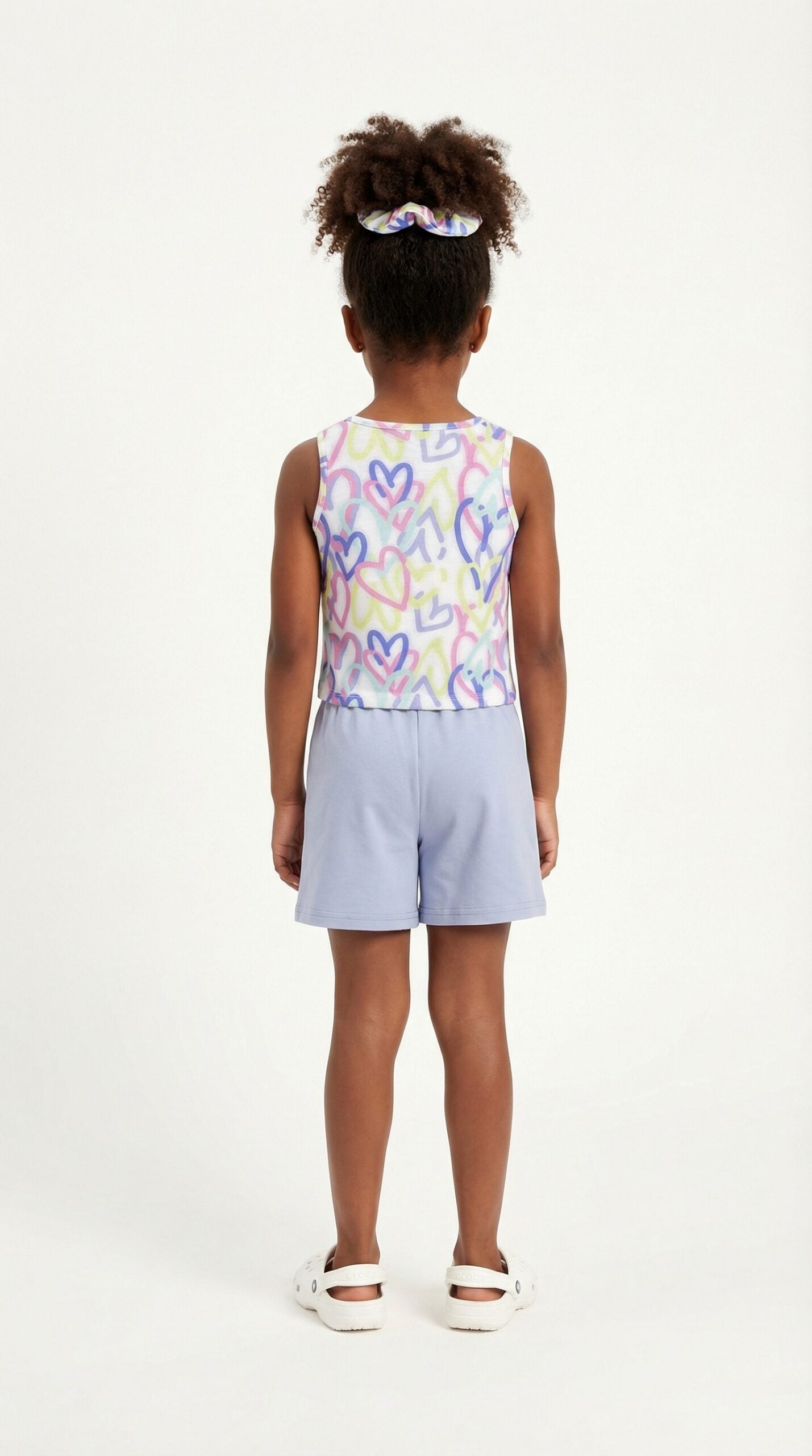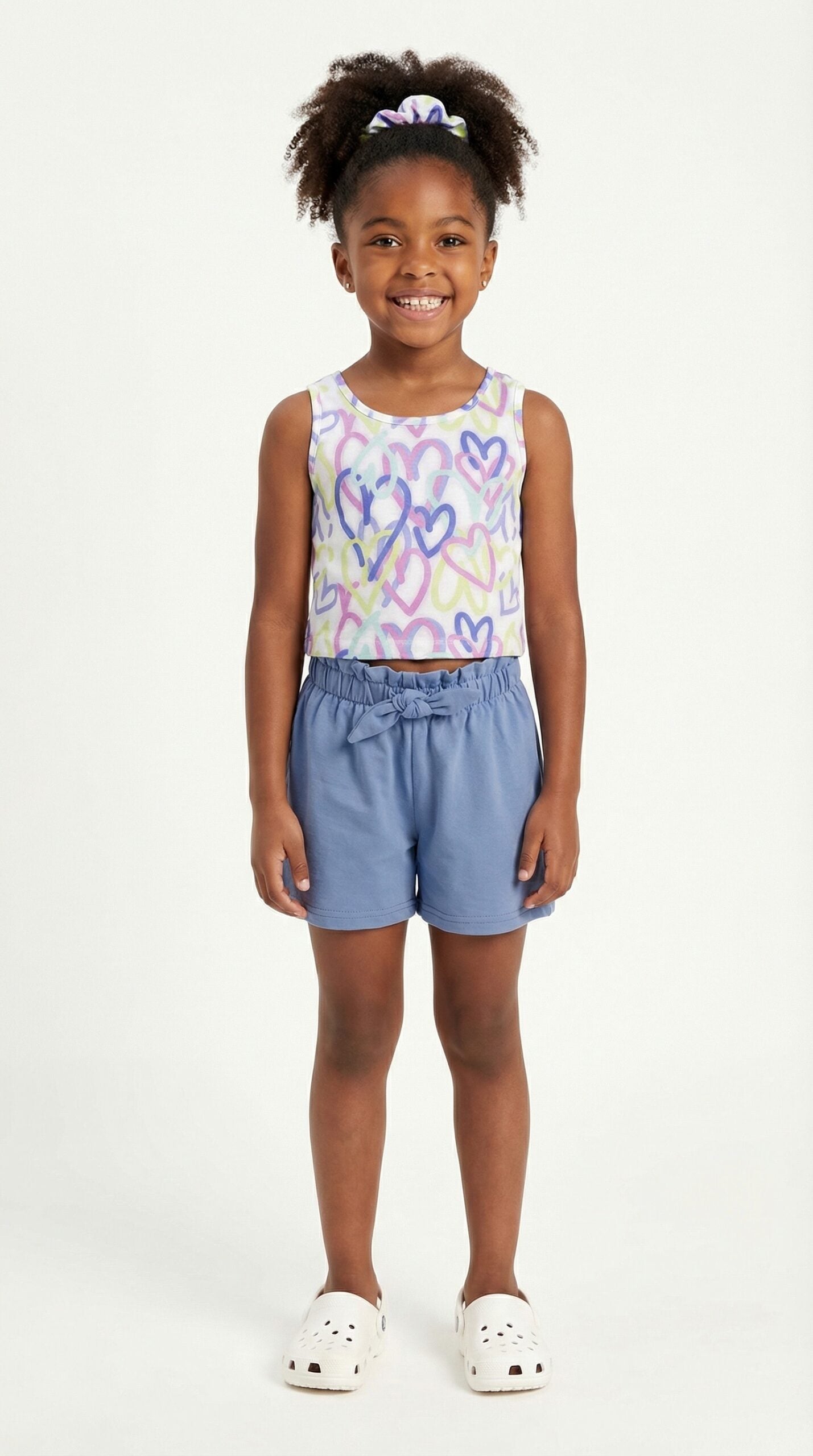 Το παιδικό ντύσιμο που εικονίζεται είναι ένα καλοκαιρινό σετ 2 τεμαχίων, ιδανικό για καθημερινές δραστηριότητες, που συνδυάζει ένα αμάνικο crop top με σορτσάκι.Η αμάνικη μπλούζα είναι λευκή και διαθέτει ένα παιχνιδιάρικο all-over print με πολύχρωμες καρδιές σε αποχρώσεις του λιλά, του κίτρινου και του μπλε. Είναι κατασκευασμένη από μαλακό βαμβακερό ζέρσεϊ ύφασμα για άνεση.Το σορτσάκι είναι σε μπλε χρώμα και διαθέτει ελαστική μέση με διακοσμητικό κόμπο/φιόγκο μπροστά. Πρόκειται για μια άνετη υφασμάτινη βερμούδα, συχνά από βαμβάκι ή λινό, που προσφέρει ελευθερία κινήσεων