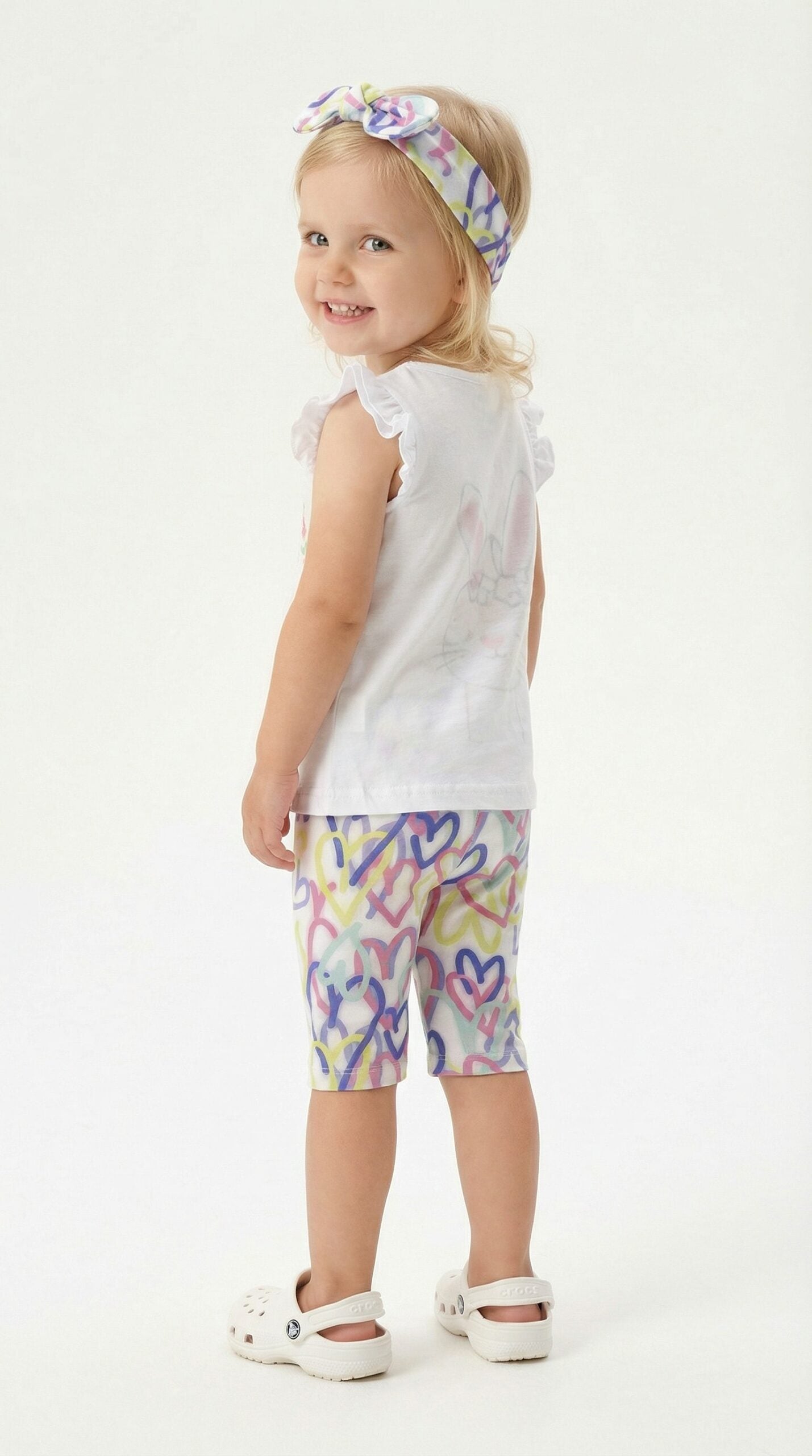 Πολύχρωμο Κολάν: Σε στυλ ποδηλατικού σορτς με εντυπωσιακό all-over print από πολύχρωμες καρδιές σε παστέλ και ζωηρές αποχρώσεις (μπλε, μωβ, κίτρινο).
