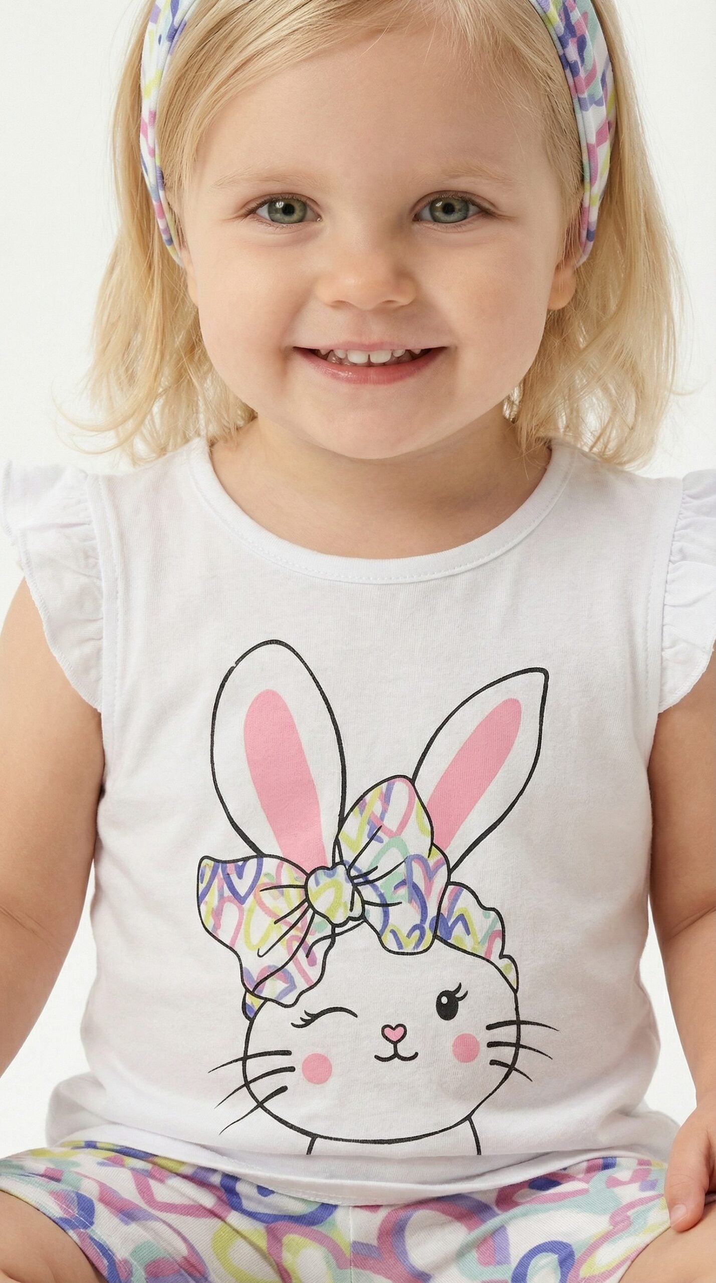 Λευκό T-shirt: Διαθέτει μια χαριτωμένη στάμπα με κουνελάκι που κλείνει το μάτι και φοράει πολύχρωμο φιόγκο. Τα διακριτικά βολάν στα μανίκια προσθέτουν μια girly και μοντέρνα πινελιά.