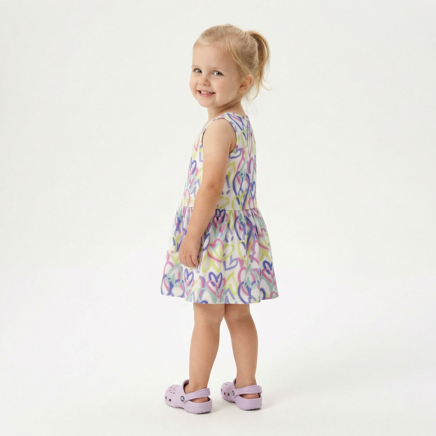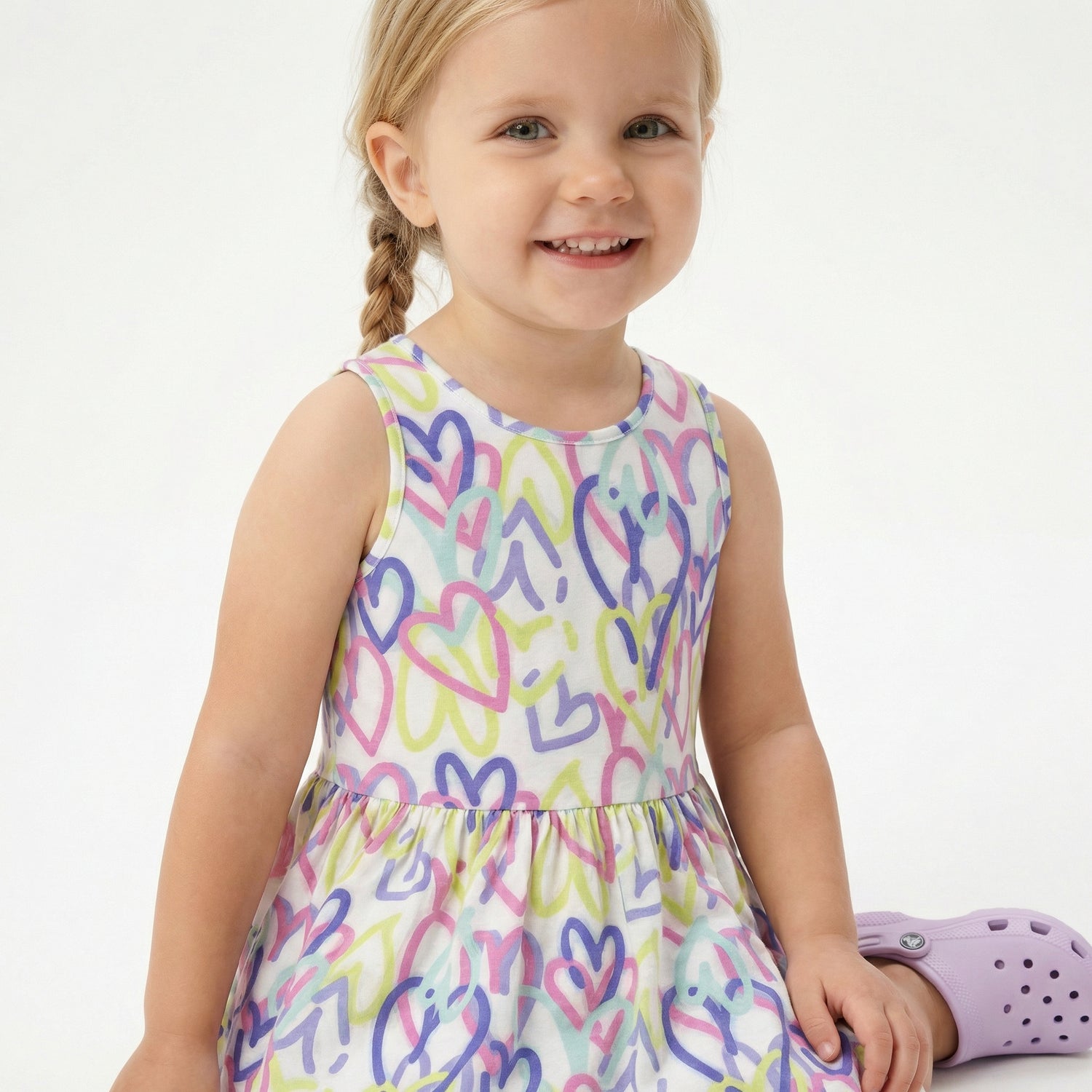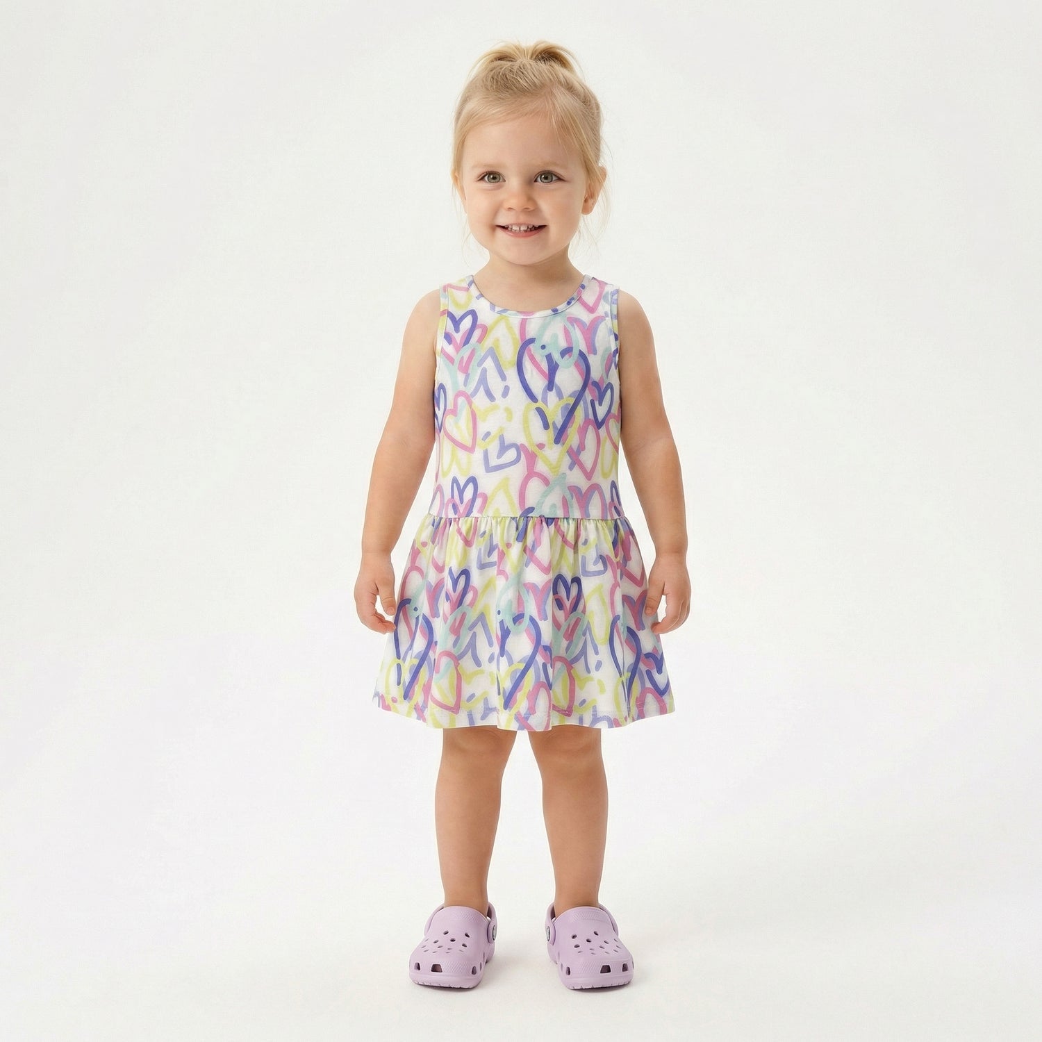Το παιδικό ντύσιμο που εικονίζεται είναι ένα αμάνικο καλοκαιρινό φόρεμα, ιδανικό για καθημερινές δραστηριότητες, το οποίο συνδυάζει άνεση και παιχνιδιάρικο στυλ.Σχέδιο: Διαθέτει λευκό φόντο με ένα εντυπωσιακό all-over print από καρδιές που μοιάζουν με σκίτσα σε αποχρώσεις του λιλά, του κίτρινου και του μπλε.